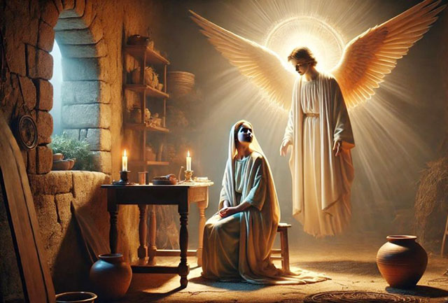 El Ángel Gabriel fue enviado por Dios a una ciudad de Galilea, llamada Nazaret, a una virgen que estaba comprometida con un hombre perteneciente a la familia de David, llamado José. El nombre de la virgen era María. El Ángel entró en su casa y la saludó, diciendo: «¡Alégrate!, llena de gracia, el Señor está contigo».