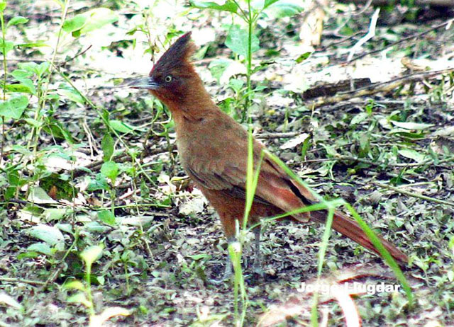 Mide 26 cm y es la mayor especie de su familia. El iris es amarillo. Ostenta una expresiva cresta. Es pardo por arriba, las plumas de la cresta son más grisáceas y oscuras; la rabadilla y la cola son rufo oscuro. La face y garganta son rufas; por abajo es pardo, y las plumas son escamadas más pálido (más pronunciado en Argentina, más oscuro hacia el norte).