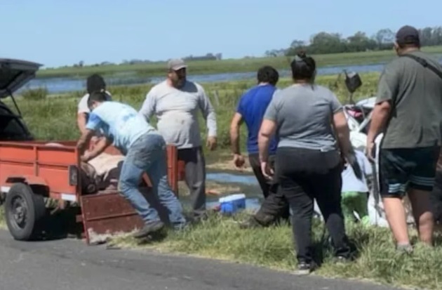 Un camión jaula que transportaba cerdos volcó en la Ruta Nacional 7 a la altura de la localidad bonaerense de Ingeniero Silveyra y, en cuanto se enteraron de la noticia, los vecinos de la zona se acercaron para llevarse a los animales, ya sea vivos o muertos.