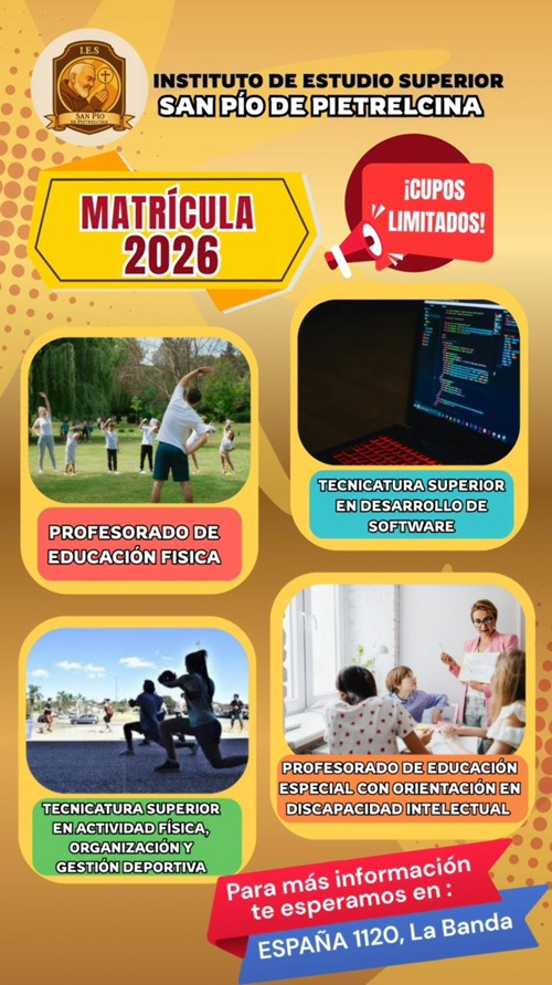 El Instituto de Estudio Superior San Pío de Pietrelcina continúa la inscripción para el Ciclo Lectivo 2026, ahora con un 30% de descuento en la matrícula para ingresantes.