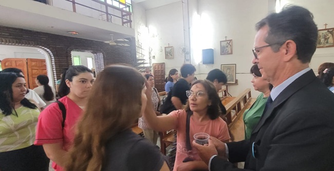 Luego se vivió un momento especial. Habitualmente la imposición de ceniza lo hace el sacerdote, pero en esta ocasión el celebrante cambió la forma e invitó a los fieles a colocarse unos a otros la ceniza repitiendo la fórmula ´convierte y cree en el evangelio´.