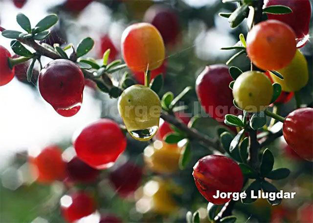 Fruto drupa de color rojo a morado oscuro en la madurez. Crece en el caldenal y en el Monte, donde es más abundante y suele formar colonias densas