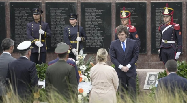 Milei dijo: “Como cada 2 de abril, estamos reunidos para recordar y honrar a aquellos que ofrecieron su vida por el valor supremo de la defensa de la patria. Esos héroes que han sabido encarnar la expresión más pura del espíritu nacional, la que surge en los momentos decisivos de la historia, sentando un precedente al que el resto de los argentinos solo podemos aspirar. A todos ellos extendemos nuestro eterno respeto y agradecimiento”.