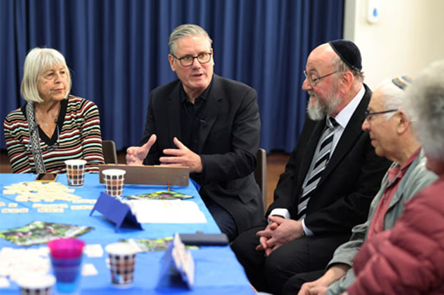 El rabino principal Ephraim Mirvis se sienta junto al primer ministro británico Keir Starmer durante una visita a la sinagoga Kenton United, que recientemente fue blanco de un ataque incendiario, en el distrito de Kenton, Londres, Reino Unido, el 23 de abril de 2026. Dan Kitwood/Pool vía REUTERS