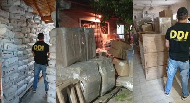 Además de la oficina, se secuestraron siete pallets completos con 554 bolsas de materiales; decenas de bultos y cajas con elementos de construcción; equipamiento gastronómico, mobiliario, iluminación, productos médicos y alimentos; cientos de cajas cerradas, bolsas industriales y bultos sueltos; electrodomésticos, luminarias, muebles y documentación comercial.
