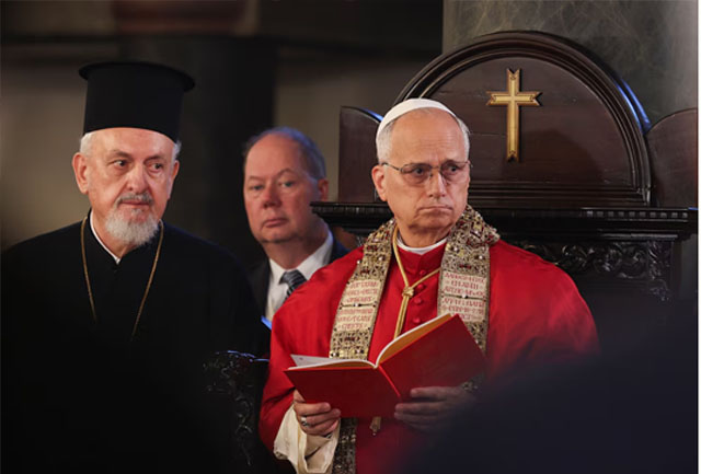 El Papa León XIV y el Patriarca Ecuménico Bartolomé I durante una bendición ecuménica al final de un servicio cristiano de oración conjunto, en la Iglesia Patriarcal de San Jorge, durante su primer viaje apostólico, en Estambul, Turquía, el 30 de noviembre de 2025. REUTERS/Murad Sezer