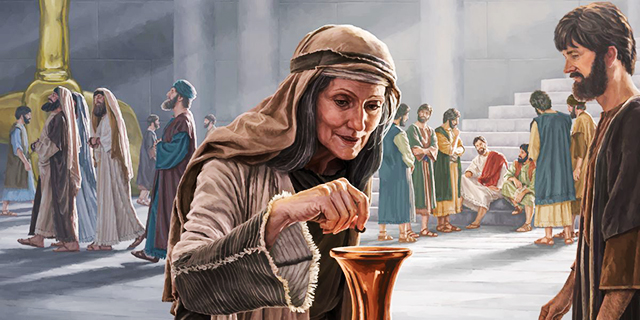 Vio también a una viuda de condición muy humilde, que ponía dos pequeñas monedas de cobre, y dijo: «Les aseguro que esta pobre viuda ha dado más que nadie. Porque todos los demás dieron como ofrenda algo de lo que les sobraba, pero ella, de su indigencia, dio todo lo que tenía para vivir.»