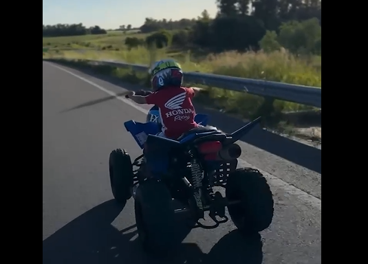 Un joven de 23 años filmó y publicó en sus redes sociales a su hijo de 5 años conduciendo un cuatriciclo sobre una ruta de la provincia de Buenos Aires. En el mismo video se lo ve sin casco en un descampado. Tras la viralización, la Agencia Nacional de Seguridad Vial (ANSV) identificó al padre del niño y solicitó la inhabilitación de su licencia de conducir por su imprudencia deliberada.