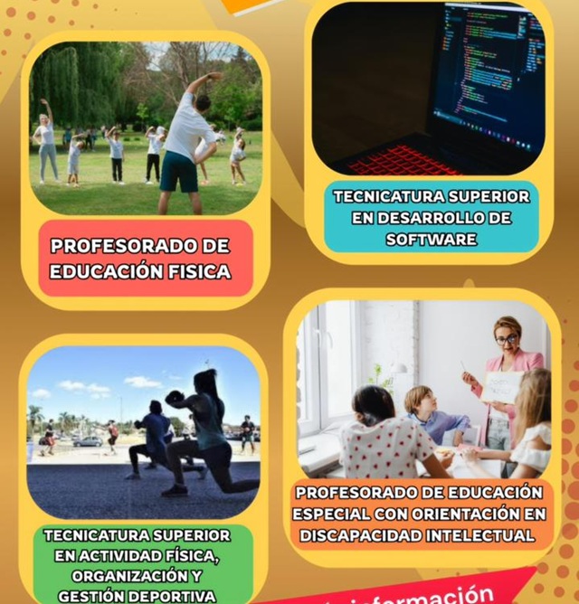 La institución ofrece las siguientes carreras: Profesorado de Educación Especial con Orientación en Discapacidad Intelectual (4 años de duración); Profesorado de Educación Física (4 años de duración); Tecnicatura Superior en Desarrollo de Software (2 años de duración); Tecnicatura Superior en Actividad Física, Organización y Gestión Deportiva (2 años de duración).