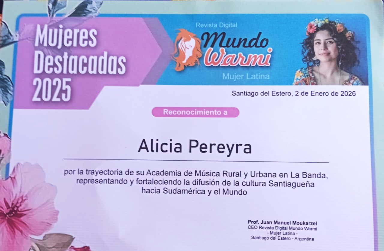 Al respecto la destacada artista de La Banda indicó, «el dos de enero, en el Forum de ciudad Capital se desarrolló un acto de nivel internacional en el que recibí la distinción Mujeres Destacadas del 2025 de Santiago del Estero».