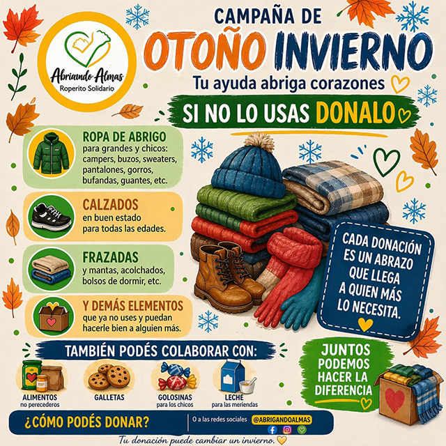 La iniciativa convoca a la comunidad a colaborar con la donación de camperas, buzos, sweaters, pantalones, gorros, bufandas, guantes, calzados en buen estado, frazadas y mantas, entre otros elementos que puedan brindar abrigo durante la temporada invernal.