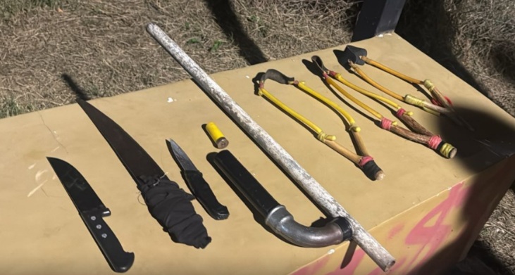 Posteriormente, en un sector montuoso cercano, los uniformados hallaron tres armas blancas, varias resorteras y una “tumbera”.