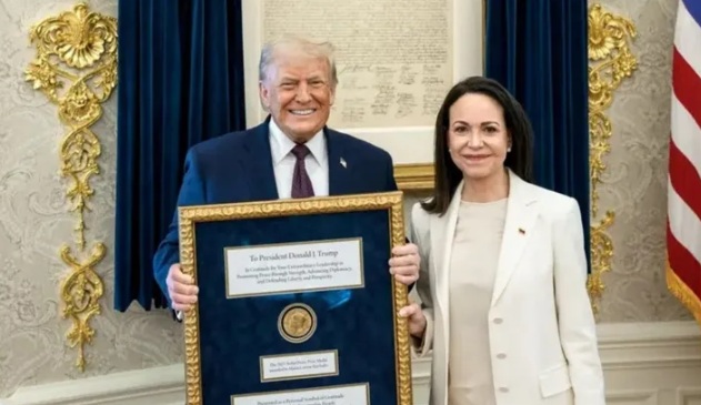 Uno de los momentos más destacados del encuentro fue la entrega a Trump de una medalla que representa el Premio Nobel de la Paz, gesto que Machado realizó en nombre del pueblo venezolano.