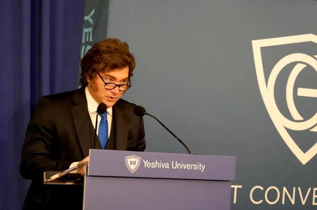 “Nos han metido dos bombas, una en la AMIA y otra en la Embajada de Israel. Por lo tanto, digamos, son nuestros enemigos. Además tengo una alianza estratégica con Estados Unidos e Israel», expresó Milei, en la frase más relevante de su exposición que contó la presentación del rabino Ari Berman, rector de la Universidad.