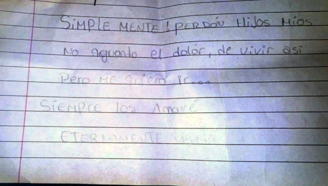 Dentro de la vivienda encontró una carta apoyada sobre un mueble. En el texto, escrito a mano, la joven se despedía de sus hijos y expresaba un profundo sufrimiento emocional. “Simplemente perdón, hijos míos. No aguanto más el dolor de vivir así, pero me quiero ir. Siempre los amaré eternamente”, decía el mensaje.
