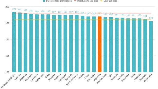 El informe reveló que solo tres provincias planificaron el ciclo lectivo con la cantidad de días exigida por el Consejo Federal de Educación (CFE): Santiago del Estero (192 días), San Luis (191 días) y Mendoza (190 días), superando el mínimo de 190 días de clases acordado.
