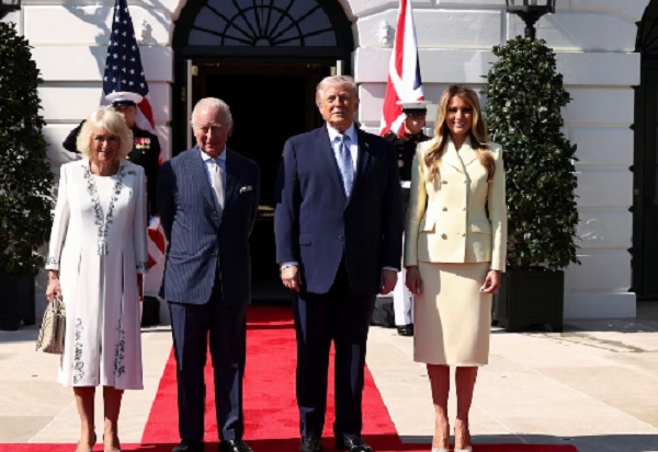 Luego del saludo inicial, Carlos III y Trump posaron junto a sus esposas para las cámaras. Melania Trump eligió un traje amarillo para la ocasión, mientras que Camila optó por un vestido de color claro.