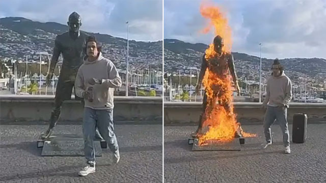 Un hecho insólito generó sorpresa este martes en Madeira, la ciudad natal de Cristiano Ronaldo. Un joven vandalizó la estatua del futbolista ubicada a pocos metros del Museo CR7, la roció con un líquido inflamable, la prendió fuego y luego bailó alrededor de las llamas.